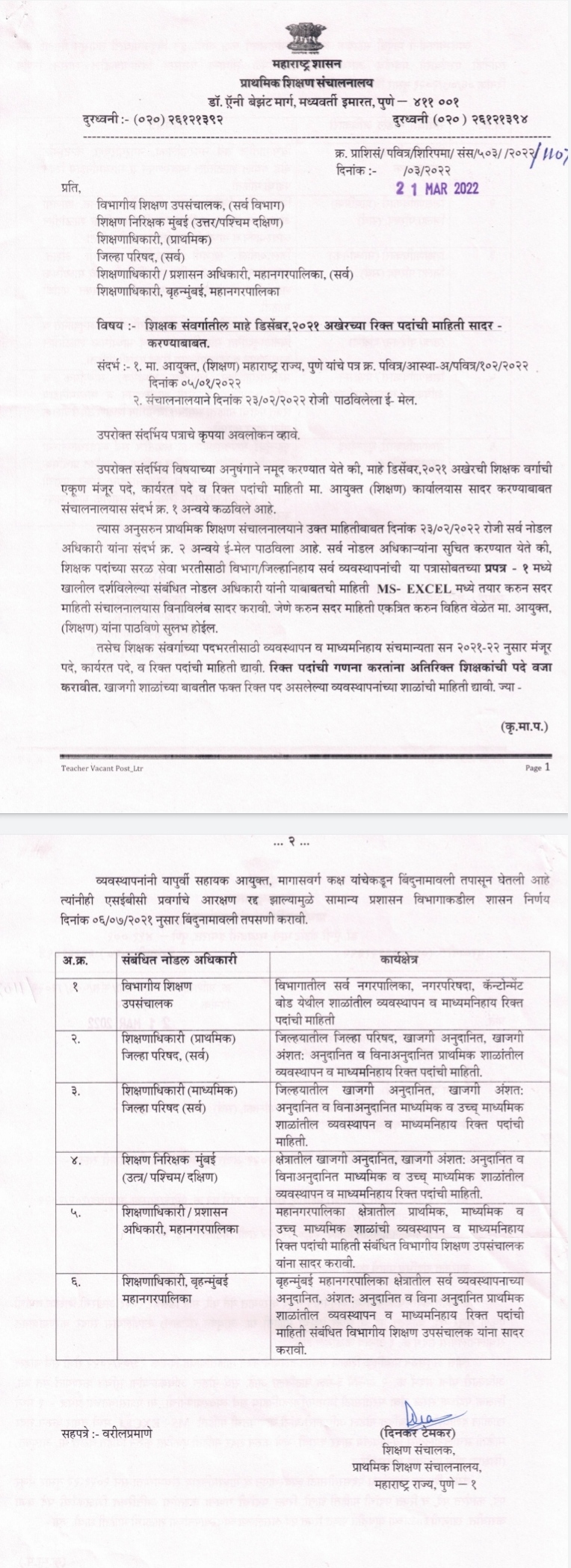 महाराष्ट्र राज्याच्या प्राथमिक शिक्षण संचालनालय कार्यालयातील दिनांक 31 मार्च 2022 च्या पत्रानुसार शिक्षक संवर्गातील माहे डिसेंबर 2021 अखेरच्या रिक्त पदांची माहिती सादर करणेबाबत विभागीय उपसंचालक, शिक्षण निरिक्षक मुंबई, शिक्षणाधिकारी प्राथमिक, शिक्षणाधिकारी अथवा प्रशासनाधिकारी महानगरपालिका सर्व, शिक्षणाधिकारी बृहन्मुंबई महानगरपालिका या सर्व जिल्ह्यातील अधिकाऱ्यांना उद्देशून सदर पत्र निर्गमित करण्यात आले आहे.