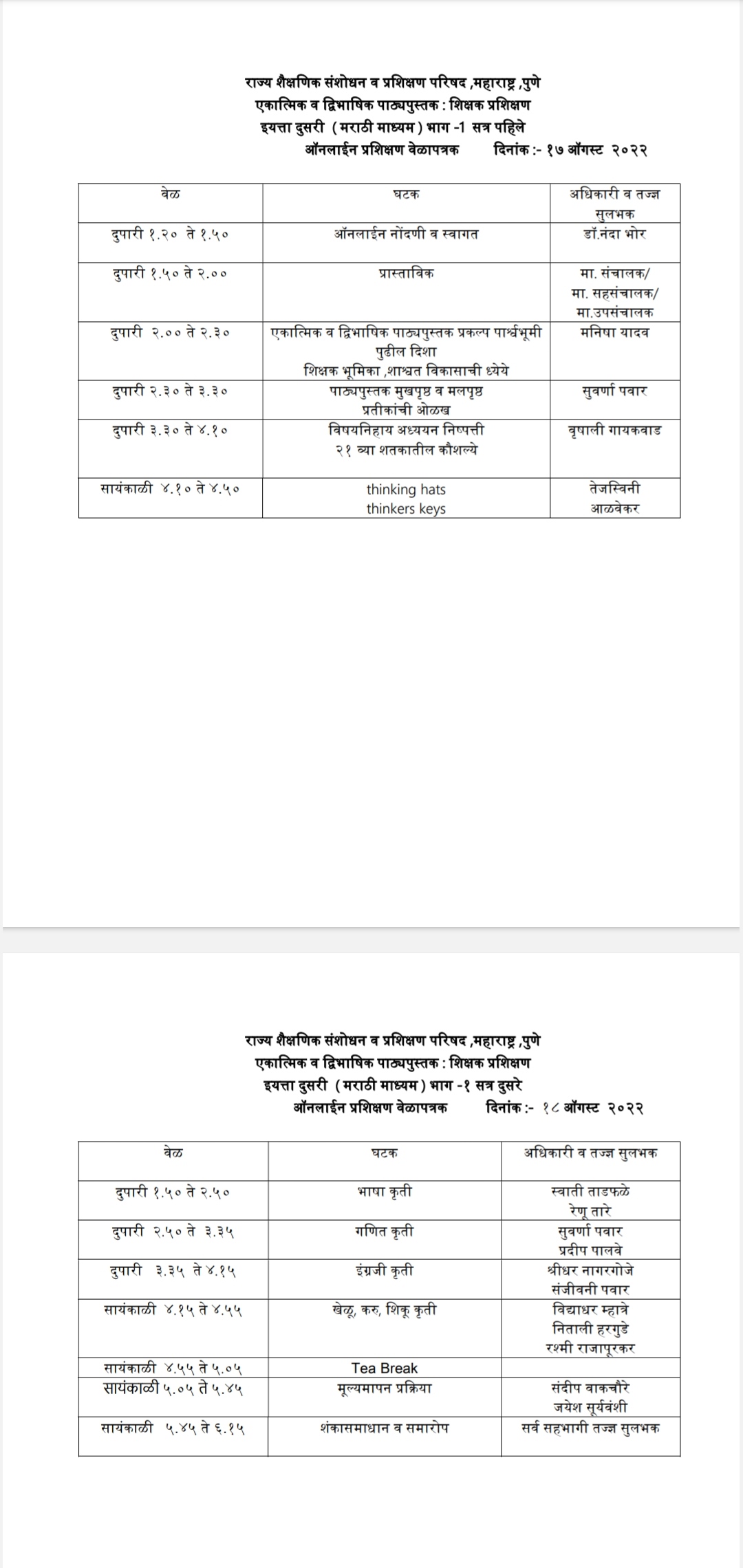 त्या अनुषंगाने राज्यातील सर्व शासकीय व शासकीय अनुदानित मराठी व उर्दू माध्यमांच्या शाळांमधील इयत्ता पहिली वर्गाला अध्यापन करणाऱ्या शिक्षकांना तसेच 288 आदर्श शाळांमधील इयत्ता दुसरीच्या वर्गाला अध्यापन करणाऱ्या शिक्षकांना एकात्मिक व द्विभाषी पाठ्यपुस्तकावर आधारित ऑनलाइन प्रशिक्षणाचे आयोजन राज्य शैक्षणिक संशोधन व प्रशिक्षण परिषद महाराष्ट्र पुणे मार्फत दिनांक 17 ऑगस्ट ते 18 ऑगस्ट 2022 रोजी सोबत दिलेल्या वेळापत्रकानुसार आयोजित करण्यात आले आहे.
